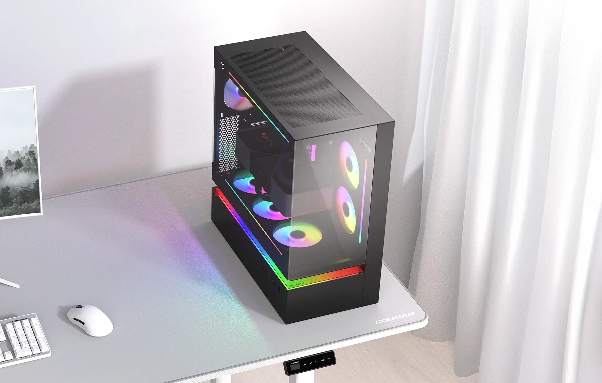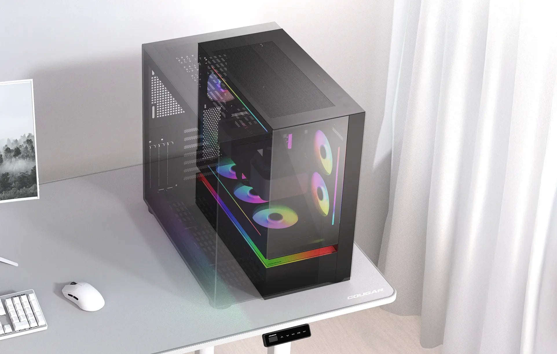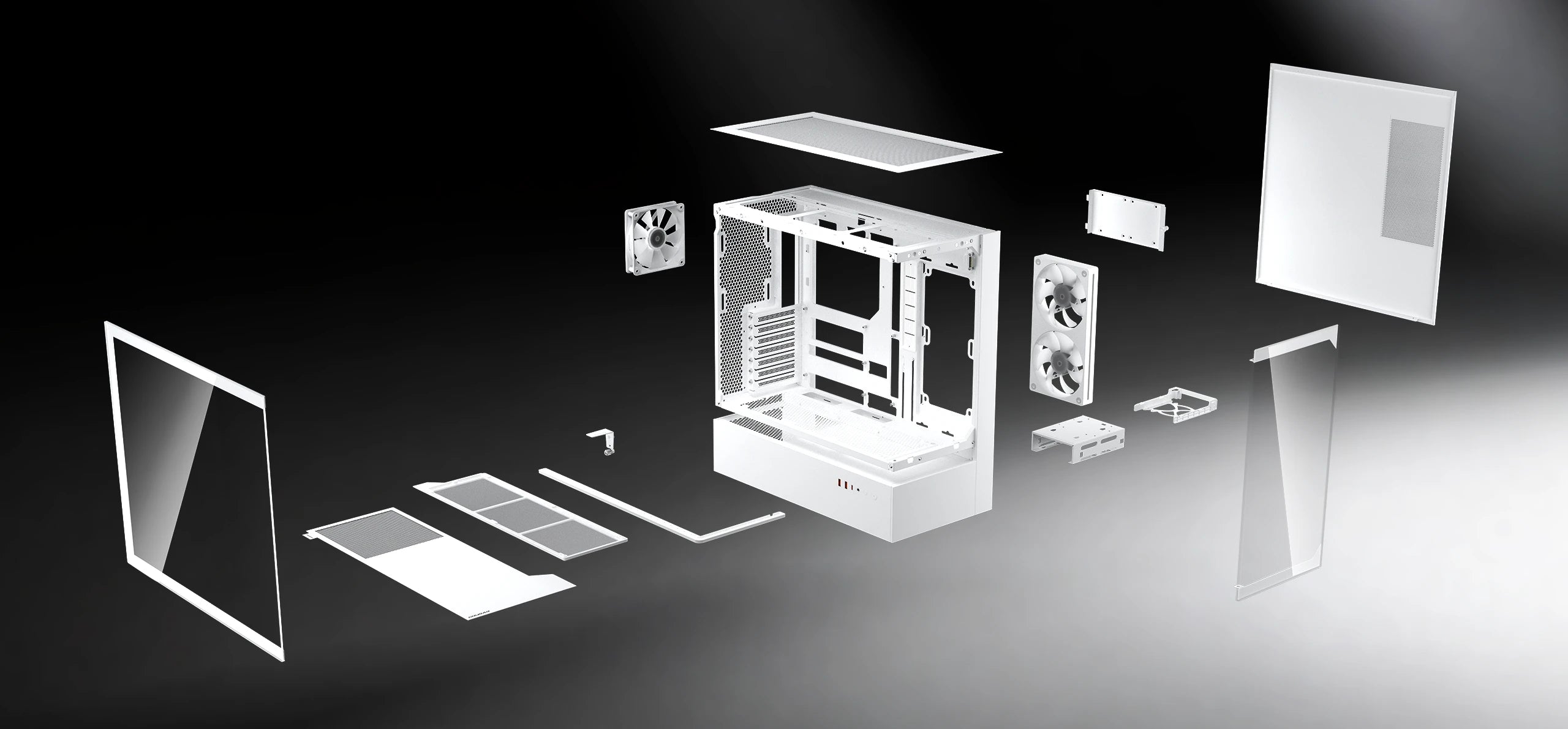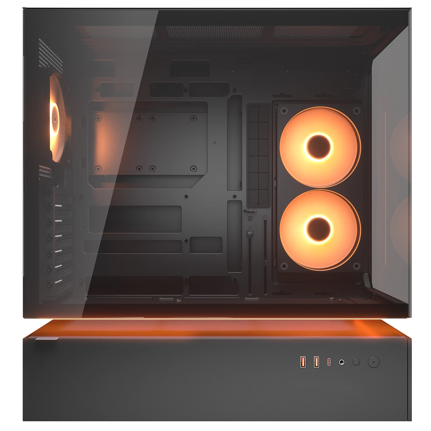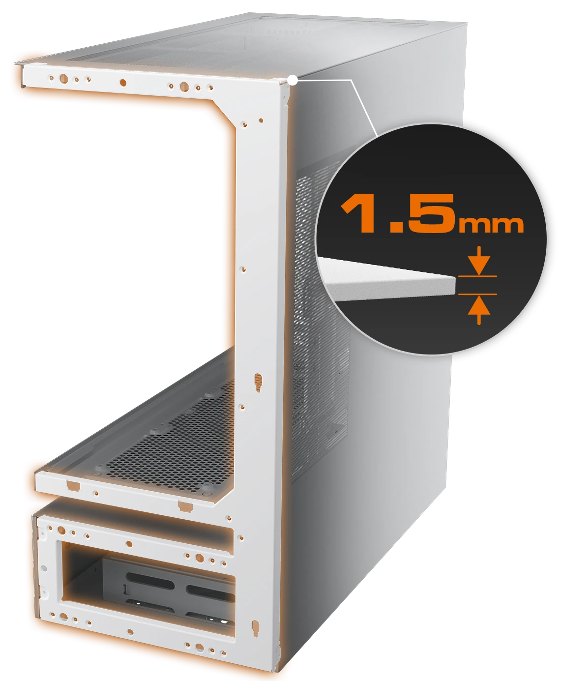 A 1.5mm-thick steel frame reinforces the chassis, preserving structural integrity even with the suspended central ventilation design. The result is a bold, open architecture that stays rigid, reliable, and ready for high-performance builds.