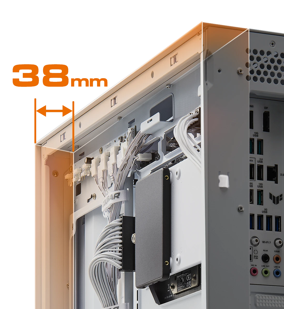38mm of clearance behind the motherboard tray improves cable management ,offering more room to route and conceal cables of varying thickness. Five adjustable Velcro straps offer versatile options to secure and tidy your layout.