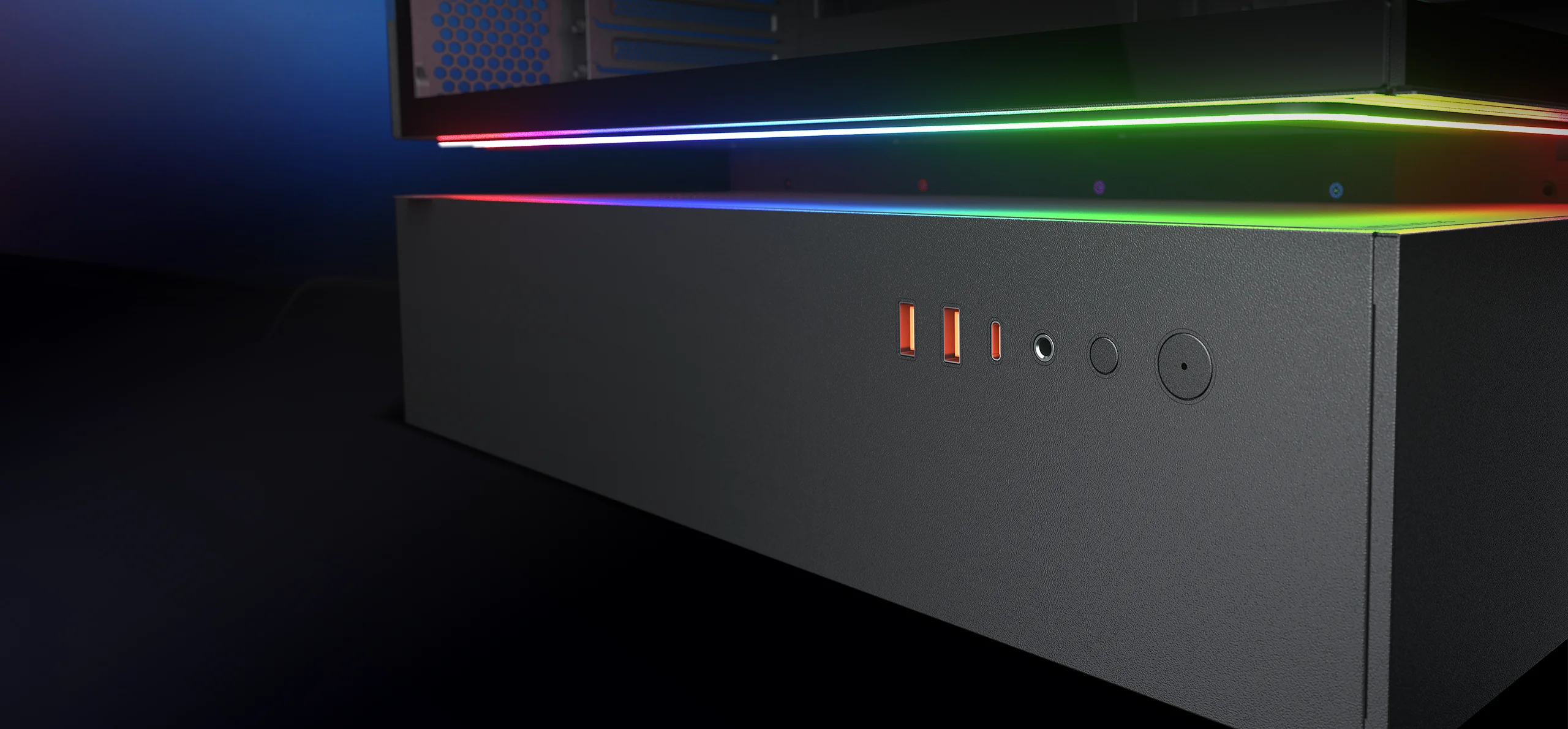 The Aurora lighting strip lights up with the integrated space of the Central Floating Ventilation structure from within, highlighting this innovative feature and displaying it as an architectural reinvention. It’s included with the case and attaches magnetically for ease and convenience.