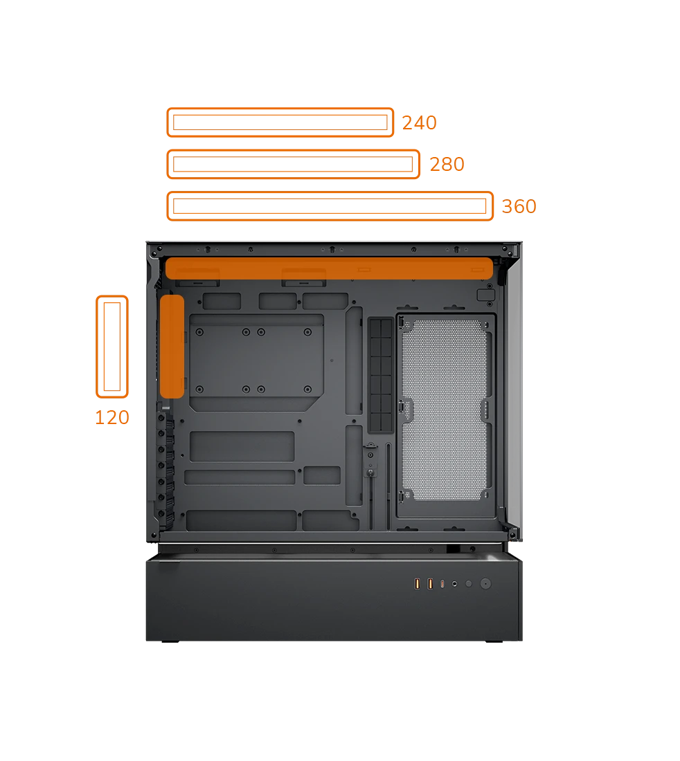 The CFV235 has a fan capacity of 3x120mm or 3x140mm on the top, 3x120mm on the floor of the main chamber, 2x120mm fans on the motherboard side, and 1x120mm (pre-installed) on the rear. Water cooling support maxes out at 360mm on the top.